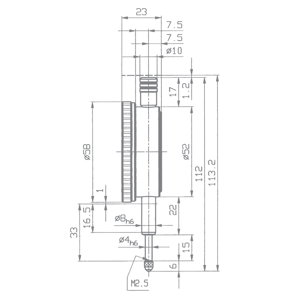 Precision dial indicator with a precision gear mechanism for high-resolution readings. The dial indicator features a particularly sensitive measuring mechanism and minimized lateral play of the measuring pin thanks to its precise fit into the shaft. All pinions of the measuring mechanism are mounted in precision perforated blocks. A metal lifting sleeve facilitates direct removal of the measuring pin and reduces the risk of dirt ingress.