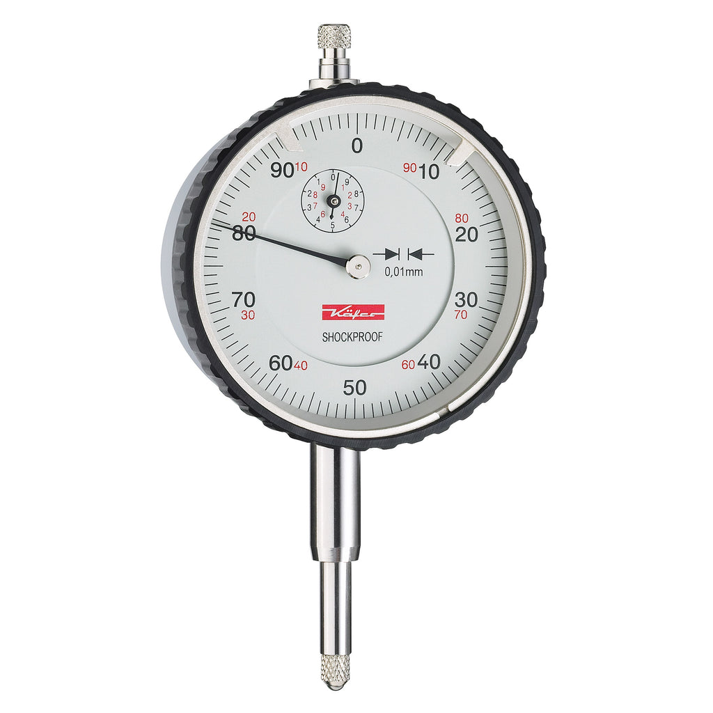 Mechanische Präzisions-Messuhr von Käfer. Robust und werkstatttauglich, mit verstärkertem Ø 5 mm Messbolzen. Durch ein hochwertiges Stoßschutzrad ist die Messuhr gegen Beschädigung bei axialen Stößen auf den Messbolzen geschützt.